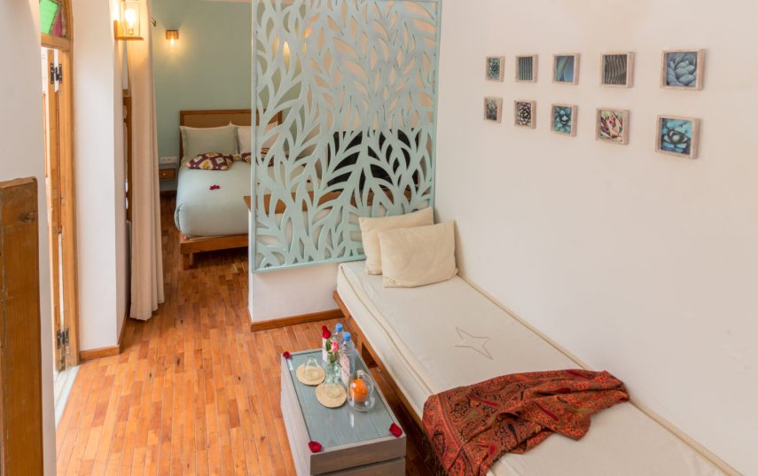 Les chambres doubles y sont judicieusement articulées autour du puits de lumière et ses terrasses sont idéales pour profiter tour à tour des Sunrise ou Sunset... Fidèle à la traditon du groupe Rabat Riads, la maison offre la